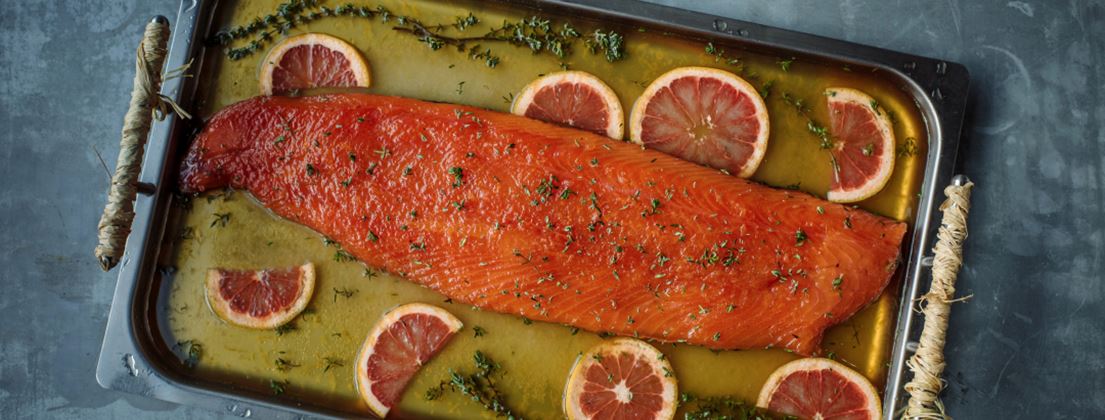 Thinly slice the grapefruit and place in the tray with beer. Do not allow the grapefruit to touch the salmon as it will burn flesh. Leave for one more day.